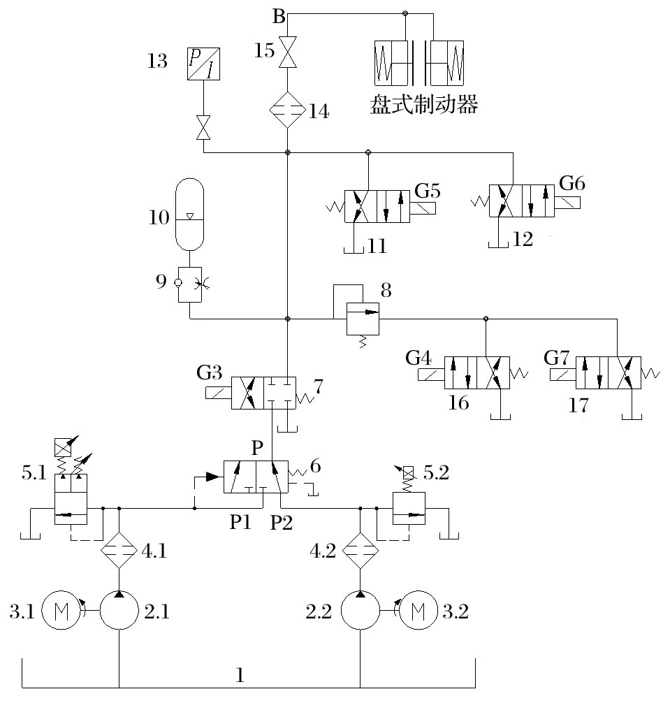 液壓站可以為盤式制動(dòng)器提供不同油壓的壓力油,油壓的變化由電液比例溢流閥來(lái)調(diào)節(jié)。制動(dòng)系統(tǒng)正常工作時(shí),電動(dòng)機(jī) 3.1 通電,電磁鐵 G3、G4、G5、G6、G7 得電,液壓泵 2.1 的壓力油經(jīng)過(guò)過(guò)濾器4.1、液動(dòng)換向閥 6、電磁換向閥 7、過(guò)濾器 14、球閥15 和出油口 B 進(jìn)入盤式制動(dòng)器。司機(jī)可以通過(guò)調(diào)節(jié)比例溢流閥 5.1 的比例電磁鐵,以控制電壓實(shí)現(xiàn)油壓的變化,從而達(dá)到調(diào)節(jié)制動(dòng)力矩的目的。當(dāng)控制電壓增加時(shí),系統(tǒng)油壓升高,制動(dòng)器開閘;當(dāng)控制電壓減小時(shí),制動(dòng)系統(tǒng)油壓下降,制動(dòng)器合閘;當(dāng)控制電壓減小至零時(shí),制動(dòng)系統(tǒng)的油壓很低,降為殘壓,提升機(jī)處于完全制動(dòng)狀態(tài)。