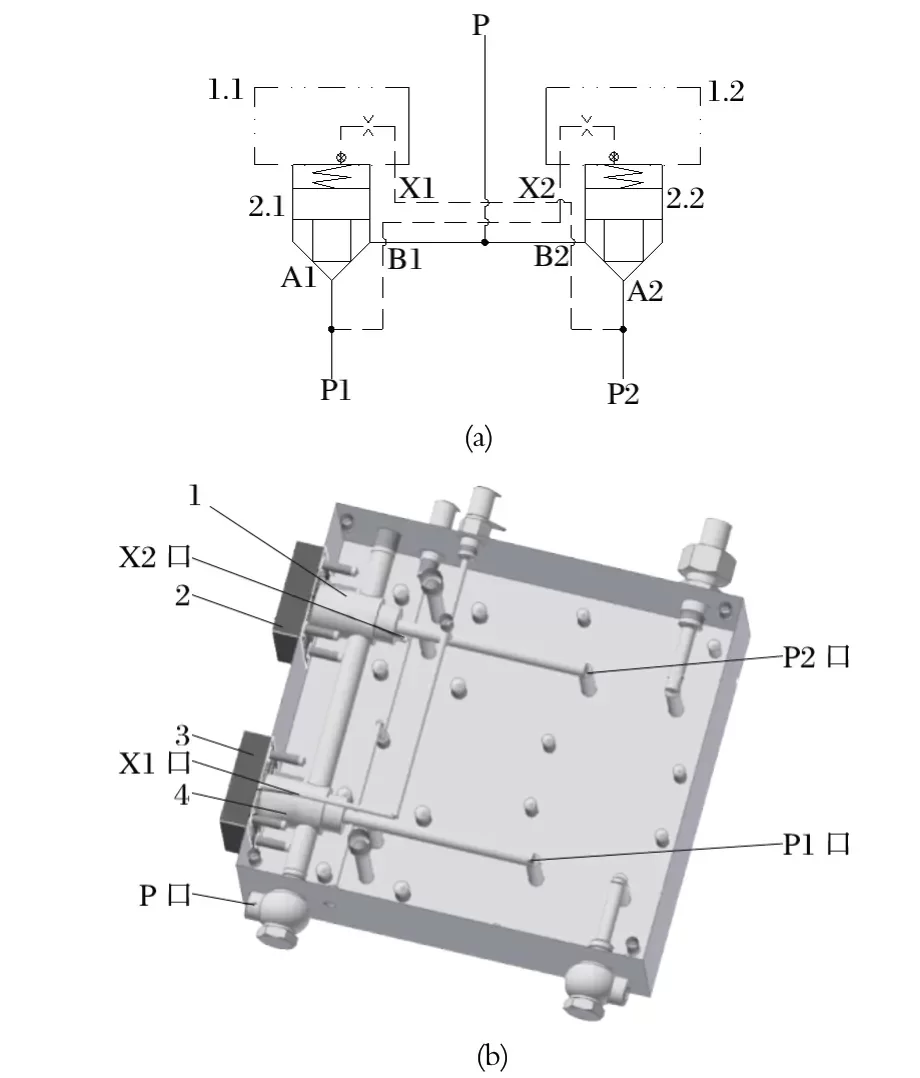 新型液動換向閥是由兩個二通插裝閥組合而成的選擇回路,具備二位三通方向控制閥功能,以實現(xiàn)兩套泵裝置的切換。中信重工 E6118B/E6119B 型液壓站的液壓閥組如圖5 所示。圖5 中,當(dāng) P1 處的泵裝置工作時,插裝組件 2.1 打開,插裝組件 2.2 關(guān)閉,由 P1 處的泵裝置向 P 口供油,P2 處的泵裝置可以維修或停用待命;反之,當(dāng) P2 處的泵裝置工作時,插裝組件 2.2 打開,插裝組件 2.1 關(guān)閉,由 P2 處的泵裝置向 P 口供油,P1 處的泵裝置可以維修或停用待命。