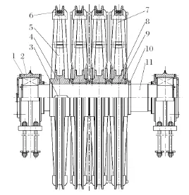 大部分天輪裝置為普通天輪結(jié)構(gòu),主要由軸承座、兩端軸承、天輪軸、游動(dòng)輪、固定輪、軸瓦、襯墊和卡箍等組成,如圖1所示。其中,左端輪子為固定輪,與天輪軸靠平鍵聯(lián)接;右側(cè) 3 個(gè)輪子為游動(dòng)輪,游動(dòng)輪與天輪軸之間有軸瓦,軸瓦與游動(dòng)輪轂之間靠高強(qiáng)度螺栓聯(lián)接;軸瓦內(nèi)部有儲(chǔ)油槽,通過(guò)潤(rùn)滑油脂來(lái)實(shí)現(xiàn)游動(dòng)輪與天輪軸靈活轉(zhuǎn)動(dòng)。當(dāng)每根鋼繩的線速度不完全相同時(shí),游動(dòng)輪與天輪軸之間可自由地相對(duì)轉(zhuǎn)動(dòng),防止鋼絲繩與襯墊之間產(chǎn)生滑動(dòng)摩擦,避免襯墊過(guò)度磨損,起到保護(hù)鋼絲繩的作用。zui 右側(cè)游動(dòng)輪的軸向定位通過(guò)安裝在天輪軸環(huán)形槽內(nèi)的兩半卡箍實(shí)現(xiàn),為了保證各游動(dòng)輪之間的間隙合適 (一般為0.2~0.5 mm),卡箍的厚度根據(jù)安裝實(shí)際情況進(jìn)行單配。該結(jié)構(gòu)的天輪裝置應(yīng)用較為廣泛,技術(shù)成熟。