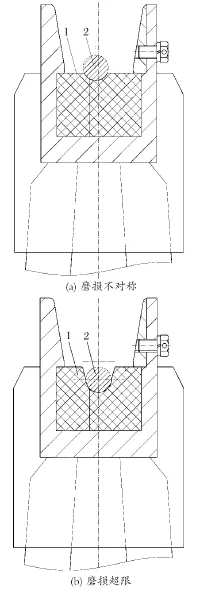 天輪裝置在返廠修復(fù)時(shí),天輪襯墊磨損一般出現(xiàn)2 種情況 (見圖 9),襯墊磨損左右不對稱和襯墊深度方向磨損超限。分析其原因:襯墊左右磨損不對稱是因?yàn)樘燧喲b置與主軸裝置不對中所致;襯墊磨損嚴(yán)重直接原因是鋼絲繩與襯墊發(fā)生了相對運(yùn)動,鋼絲繩打滑,輪緣偏擺較大也是原因之一。