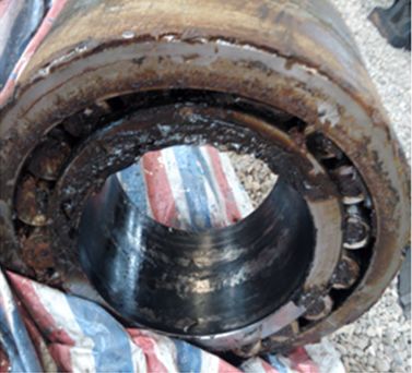 返廠修復(fù)的天輪裝置軸承座打開后,發(fā)現(xiàn)內(nèi)部多為脂水混合物,軸承內(nèi)部銹蝕嚴(yán)重,如圖8所示。在正確使用、維護(hù)及時(shí)的情況下,軸承不應(yīng)出現(xiàn)這種問題,其原因是:軸承座端蓋密封年久老化,在露天雨水的沖擊下,雨水從失效的密封處進(jìn)入軸承座內(nèi)部,使得軸承潤滑不良,在重載條件下造成軸承磨損銹蝕。