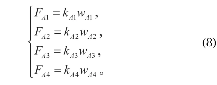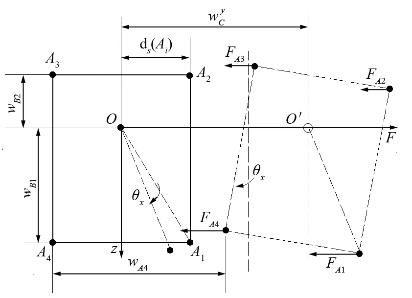 提升容器的罐耳在其中一個(gè)方向不對稱布置,由于 4 根罐道繩底部張緊力相同,在容器上下 4 個(gè)約束點(diǎn)平面上,罐道繩的橫向剛度相同,其力臂越大的約束點(diǎn),水平位移越大,它對容器的水平約束力越大,使容器產(chǎn)生一個(gè)水平轉(zhuǎn)矩。當(dāng)容器在水平 y 軸上受外力 F 作用,在罐耳 A1、A2、A3、A4 處產(chǎn)生的橫向位移依次為 wA1、wA2、wA3 和 wA4。罐耳 A1、A2、A3、A4 處的橫向力依次為