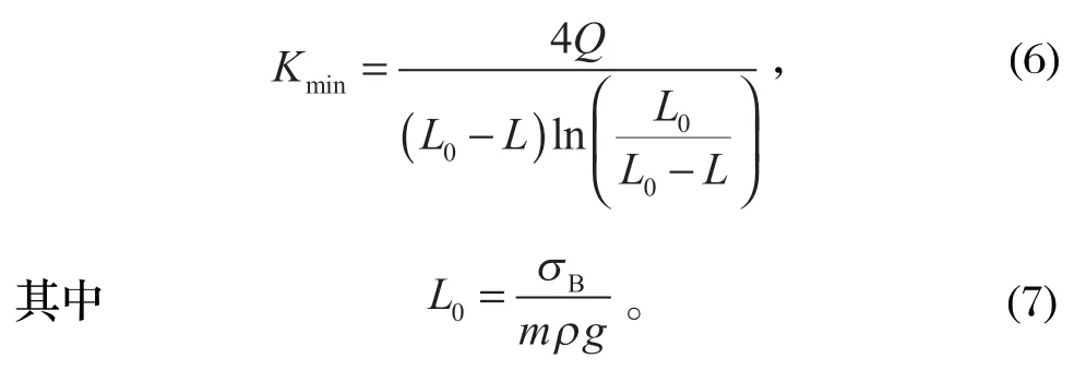 式中:L0 為罐道繩ji限懸垂長度,m;σB 為罐道繩的抗拉強(qiáng)度,N/m2;m 為罐道繩的安全系數(shù),取 m=6;ρ 為罐道繩的密度,平均取 9 000 kg/m3。