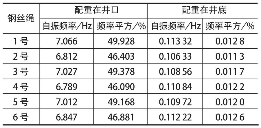 3 故障診斷分析3.1 鋼絲繩張力測試分析 鋼絲繩張力測試在 2 種工況下進行,分別是配重在井口時和配重在井底時。測試時,提升機要保持靜止狀態(tài),用小錘依次敲擊鋼絲繩,并用測振儀器記錄數(shù)據(jù)。從非驅(qū)動側(cè)到驅(qū)動側(cè)的鋼絲繩編號為 1~6,如圖 2 所示。鋼絲繩振動測試結(jié)果如表 1 所列。