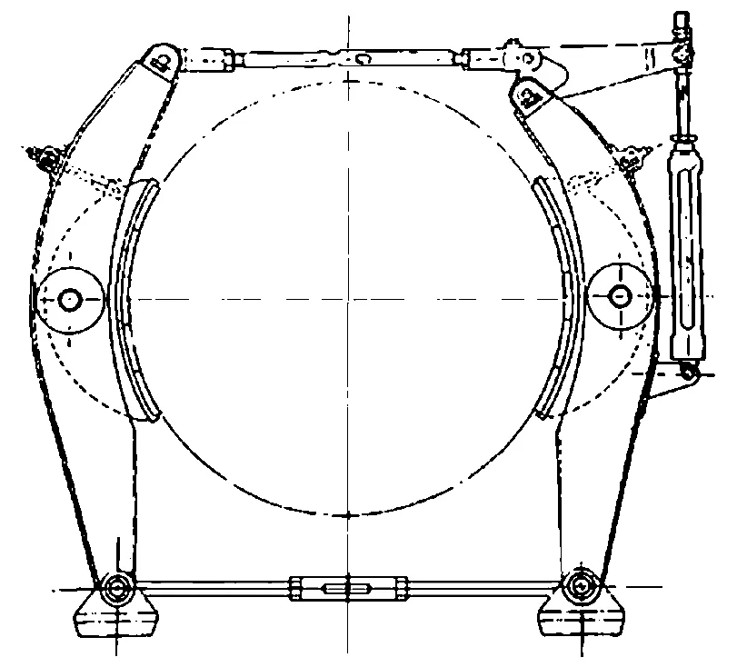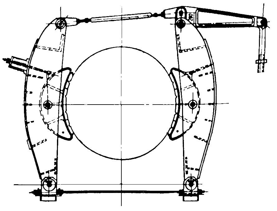 (3)綜合閘 早期國產的 JKA 型提升機,舊角移式閘瓦存在磨損不均問題,其制動系統(tǒng)的改造采用綜合閘(見圖 1),以減少閘瓦磨損,延長閘瓦使用壽命。