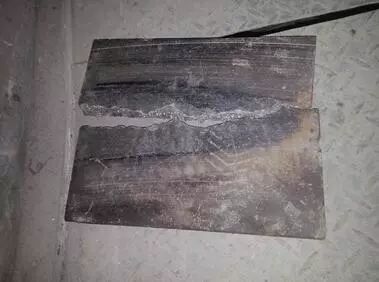 現(xiàn)場觀察到,在制動盤上沿圓周分布有油污污染的痕跡,如圖2所示。拆掉在用的盤形制動器后,發(fā)現(xiàn)所有閘瓦磨損嚴(yán)重,且各個閘瓦磨損不均勻,甚至個別閘瓦已經(jīng)斷裂,如圖3所示。還發(fā)現(xiàn)制動器內(nèi)部聯(lián)接襯板筒體和活塞的大螺栓出現(xiàn)松動,碟形彈簧組中有個別碟簧斷裂,活塞處的密封圈也已經(jīng)老化破損。