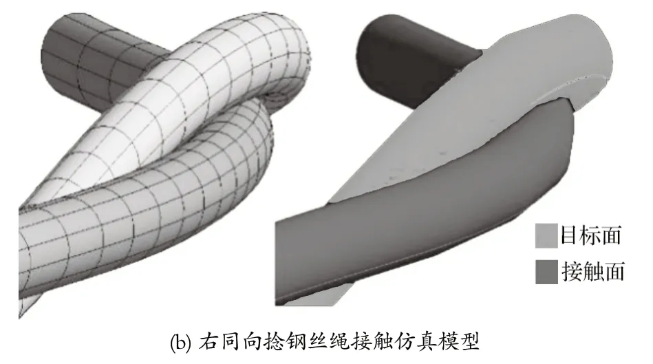 實際加載時,右同向捻的鋼絲繩一端固定,在鋼絲繩的一端進行加載。從圖7(a) 可以看出,此時,加載端的鋼絲繩產(chǎn)生與繩股捻制方向相反的變形,并且在繩槽底部接觸位置的應力較大,這個應力是使鋼絲繩出現(xiàn)扭轉(zhuǎn)變形的主要原因。所以說,靠近繩槽底部的變形其實是比較小的。此外,整個系統(tǒng)中位于繩槽位置處的位移變化相對較大。從圖7(b) 可以看出,鋼絲繩和天輪在接觸位置處受到集中應力的作用,呈現(xiàn)出層狀的分布規(guī)律;在鋼絲繩和天輪接觸點內(nèi)側(cè)表現(xiàn)為壓應力,外側(cè)表現(xiàn)為拉應力,并且同向捻制鋼絲繩股內(nèi)變形大于右交互捻;鋼絲繩的外層絲等效應力表現(xiàn)出等幅波動,幅度變化也呈現(xiàn)出一定的規(guī)律性;在鋼絲繩模型加載位置端和約束端面上,受到約束作用,導致應力突然集中,在端面位置的等效應力其實是大于股內(nèi)鋼絲其他位置的等效應力。