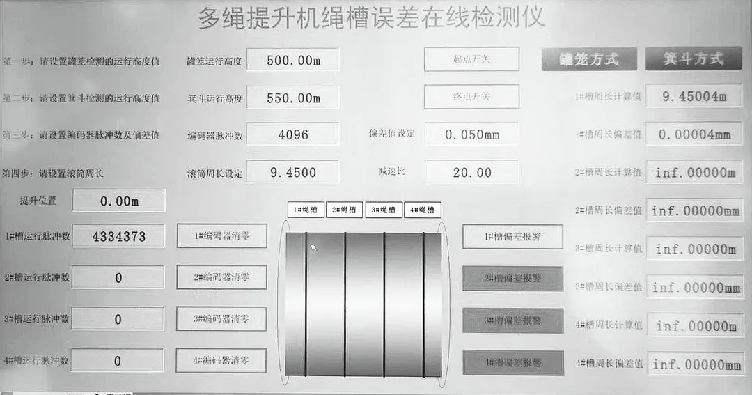繩槽誤差在線檢測報警裝置的功能:①旋轉(zhuǎn)編碼器測量卷筒的周長,將繩槽直徑放大 3.14 倍,如果運行 50 圈,相當于放大了 157 倍,準確性高,存儲系統(tǒng)對測距數(shù)值進行存儲;②PLC 記數(shù)運算裝置具有比較功能,繩槽誤差超過要求時,顯示器上會出現(xiàn)報警畫面,及時提醒提升機管理員進行調(diào)繩,避免出現(xiàn)提升事故;③其余數(shù)據(jù)信息通過顯示器進行動態(tài)顯示,可以直觀了解每根鋼絲繩的運行速度,每個繩槽的直徑誤差,易于發(fā)現(xiàn)繩槽磨損規(guī)律,提高檢查及檢修的工作效率。繩槽誤差監(jiān)控應(yīng)用如圖1 所示,繩槽誤差監(jiān)控軟件報警界面如圖2 所示,提升機卷筒直徑計算界面如圖3 所示。